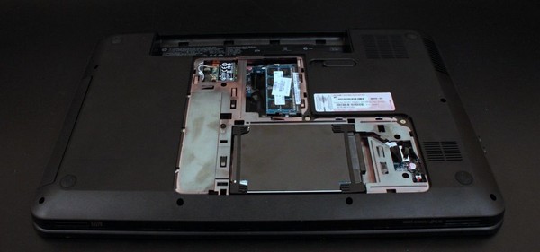 На нижней плоскости лэптопа стандартно располагаются крышки, закрывающие ниши с жёстким диском и планками оперативной памяти, и, конечно же, аккумулятор. Помимо этого на дне расположены пять отверстий для охлаждения, что намекает о довольно высокой рабочей температуре.